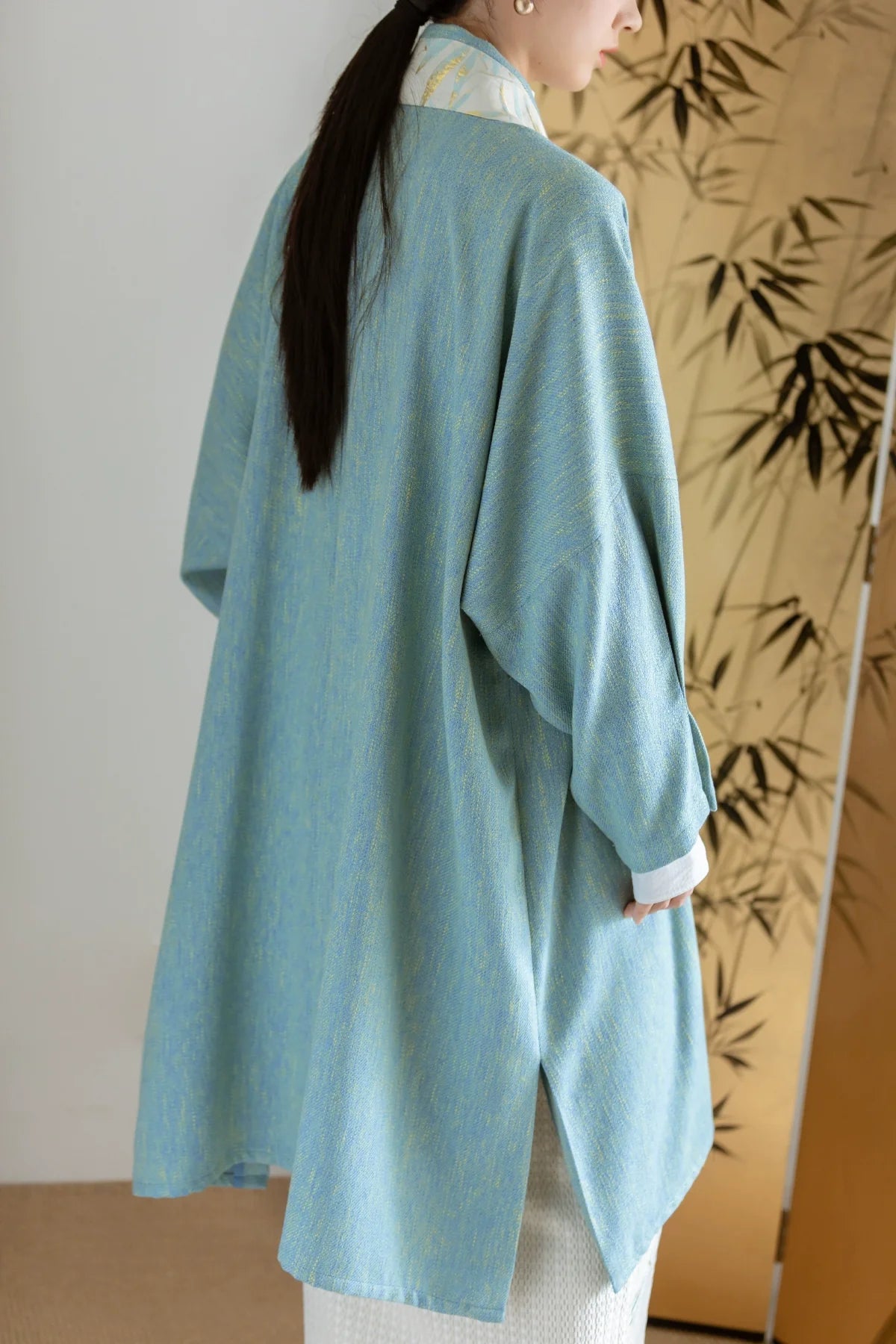 La pièce maîtresse de cet ensemble est une veste longue en tweed bleu ciel clair inspirée du Beizi (褙子) du XIIIe siècle. Le tissu en tweed assure à la fois chaleur et confort, ce qui en fait un choix idéal pour les journées plus fraîches. Son design élégant est orné de brocarts bleu clair et dorés, présentant des motifs complexes de bambous et d'oiseaux.