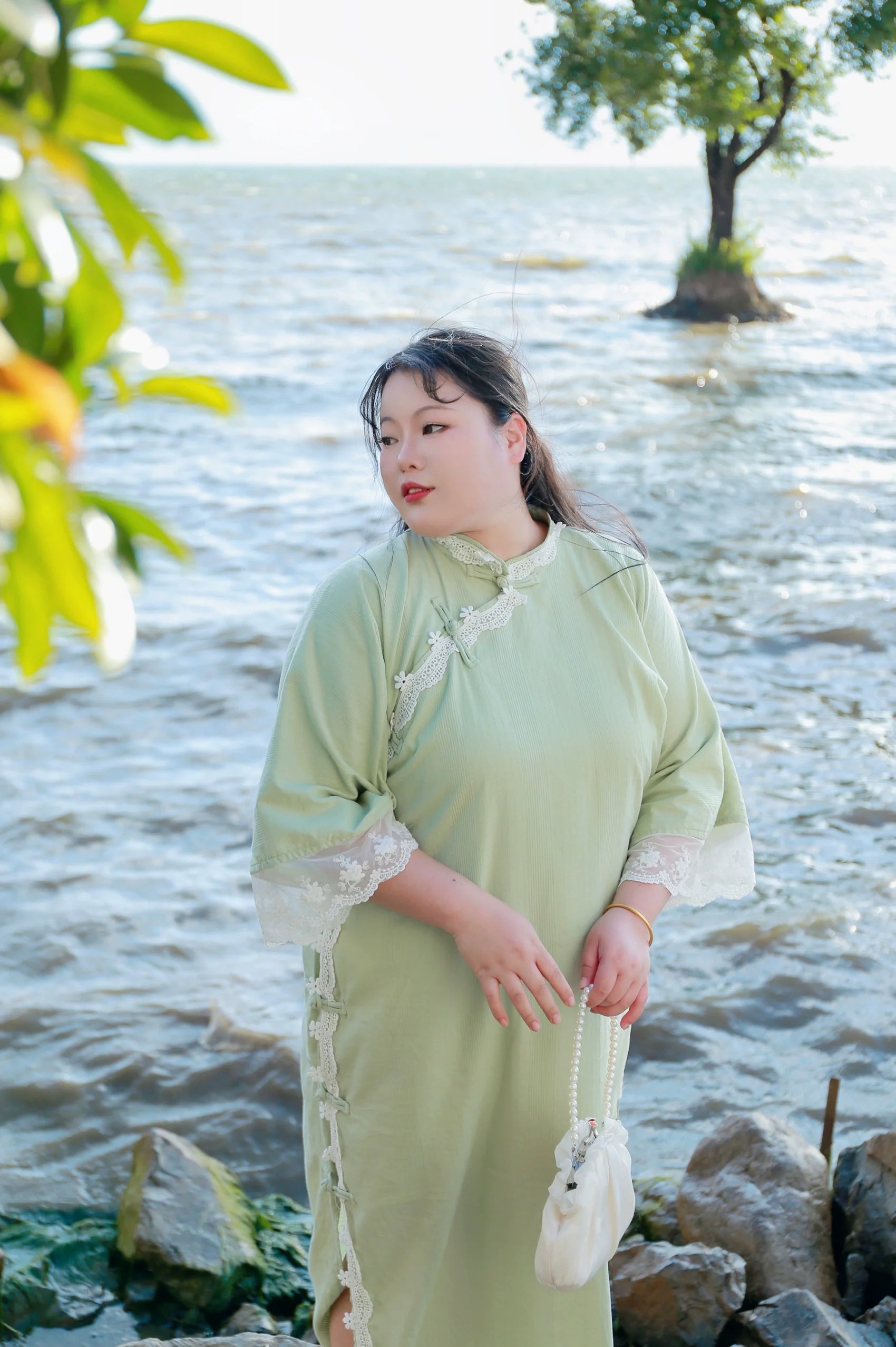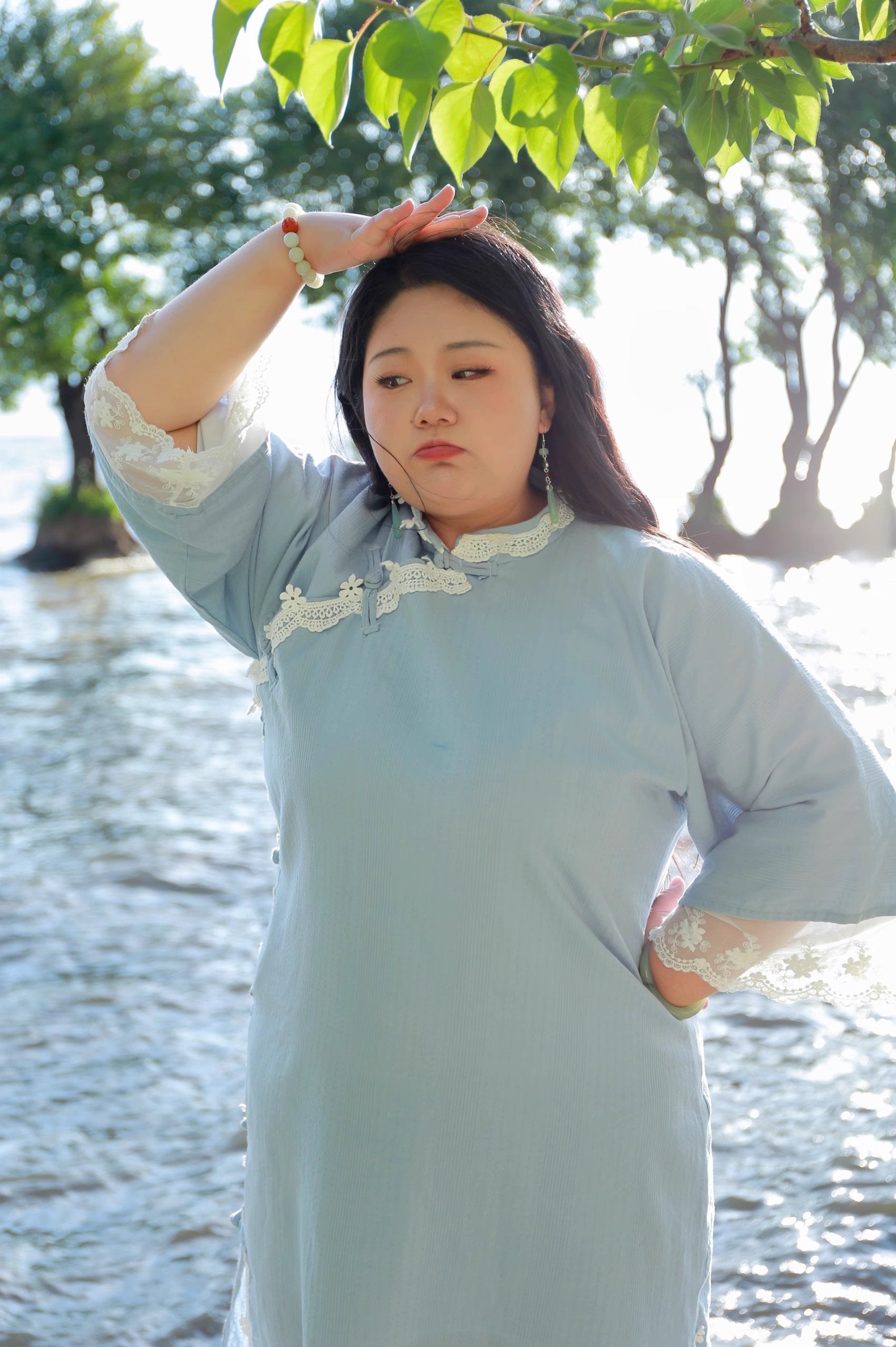 Bohé 薄荷 Bleu Menthe Modernisé Grande Taille Quotidien Dentelle Coton Manches Cloche Qipao