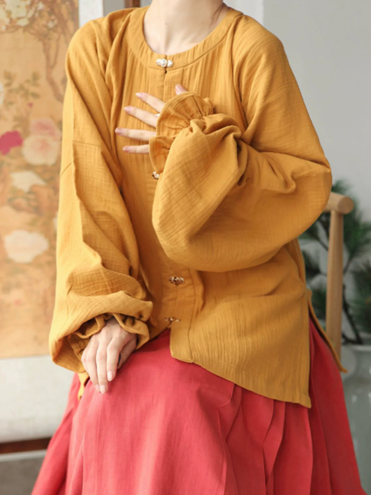 Un charmant haut s'inspirant du classique Yuanling Ao 圆领袄 de la dynastie Ming. Il présente des manches pipa « luth » et des poignets froncés, ajoutant une touche ludique au design traditionnel. Fabriqué à partir de coton doux et respirant, il assure le confort tout en conservant un aspect soigné.