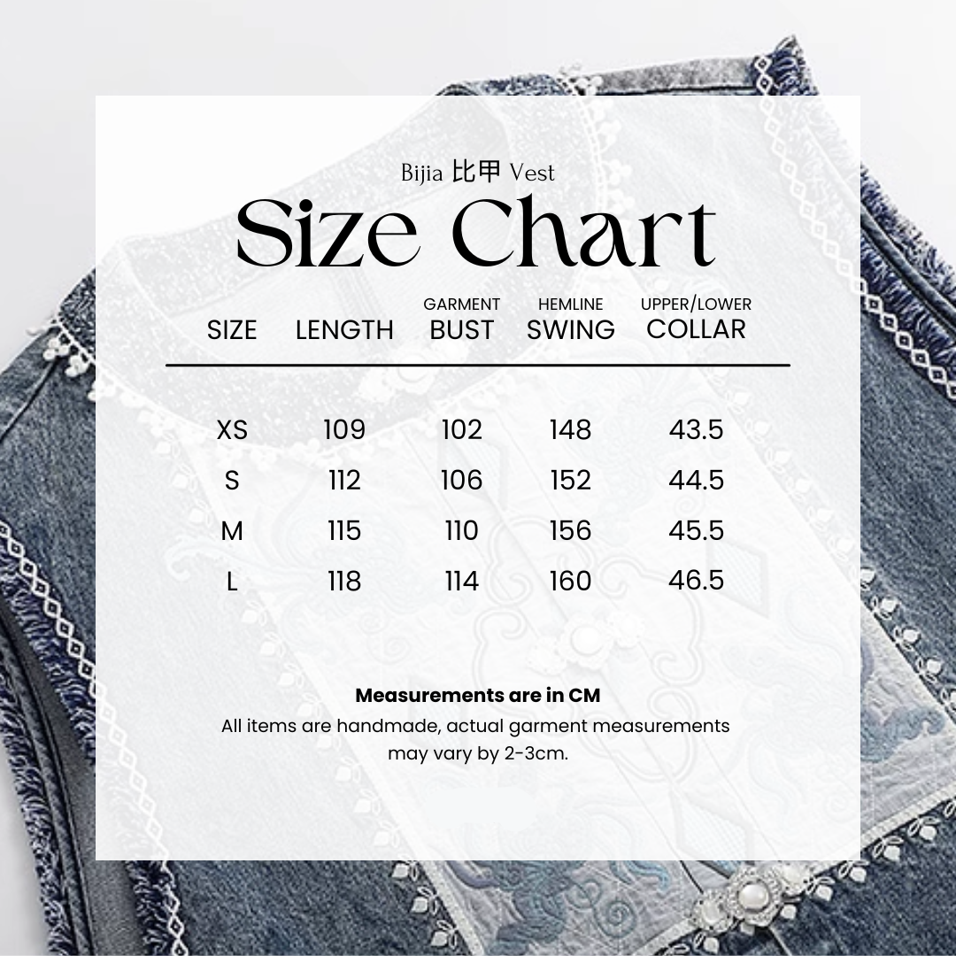 Next, add the star of the show: the denim Yuanling Bijia 圆领比甲 (round collar vest). The round collar shows off any standing collar garment perfectly, while creating an elongating effect on the body. On the chest, a modernized Buzi 補子 (mandarin square). Once, a symbol of your court ranking. Now, a fashionable and lacy accent!