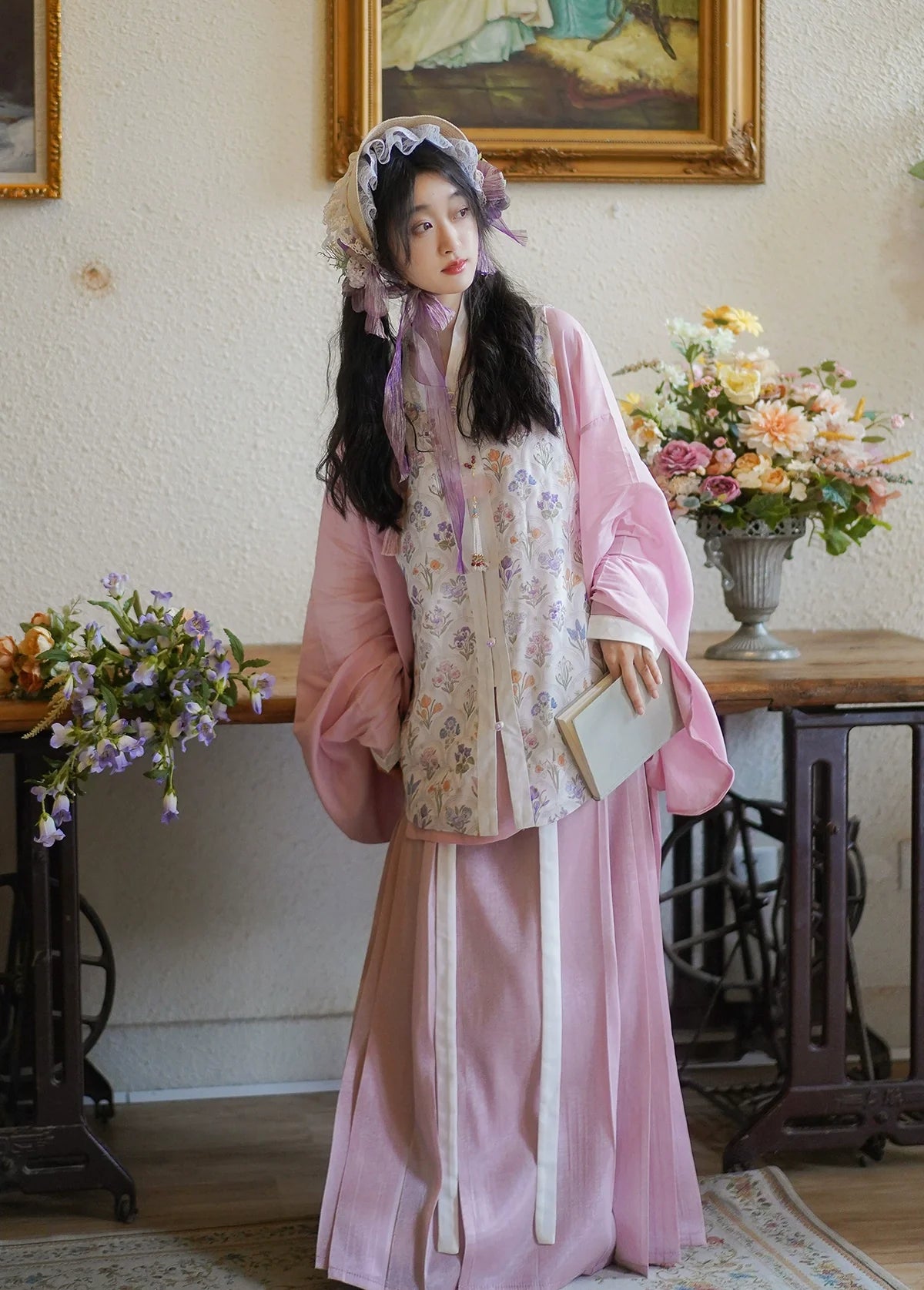 Un gilet floral chéri pour la princesse hanfu quotidienne, avec des fleurs imprimées de style art déco dans de charmants motifs festonnés.