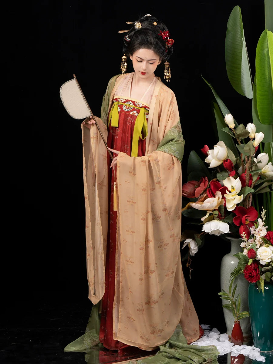 N'oubliez pas votre châle Pibo 披帛, c'est un accessoire indispensable à toute tenue Tang ! Doté de textiles floraux de style Tang, ce châle ajoute une autre couche de dimension à cet ensemble éthéré.