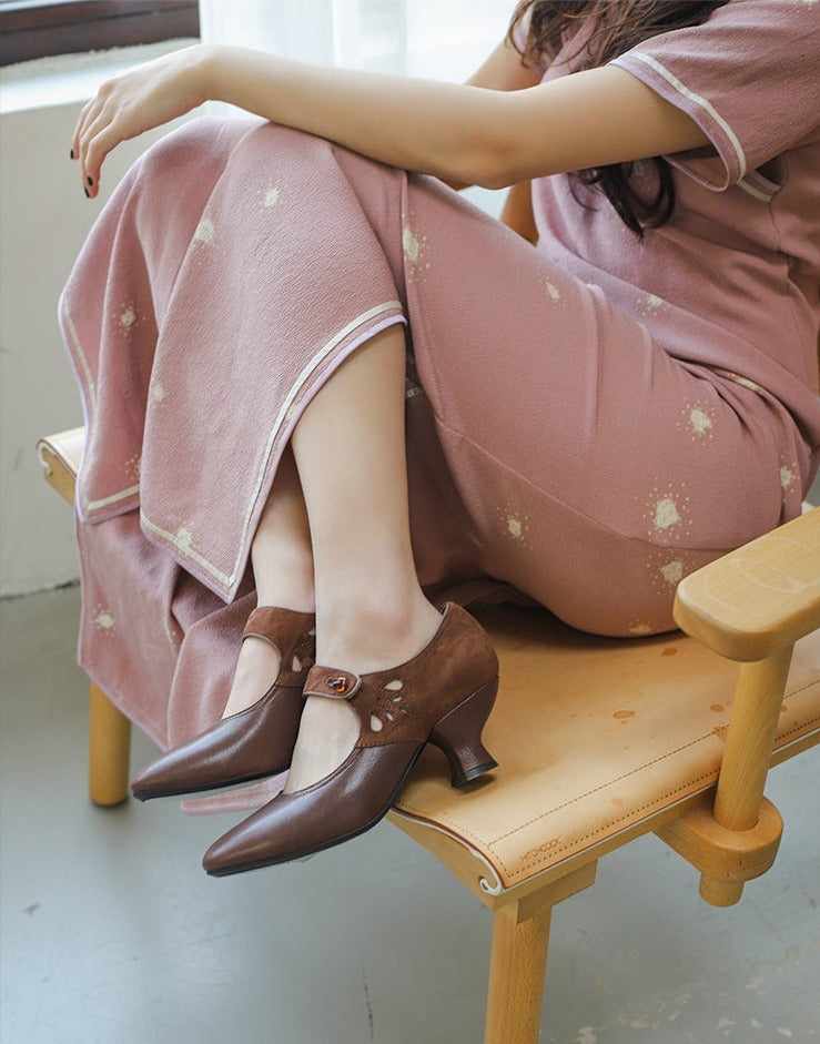 Chaussures à talons chaton faites à la main dans les années 1920/30, faisant référence à des chaussures de danse swing vintage. Doté de trous de serrure sur les côtés des bretelles, un style très populaire de cette époque !