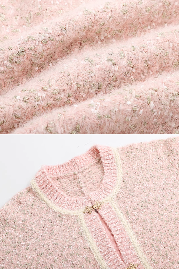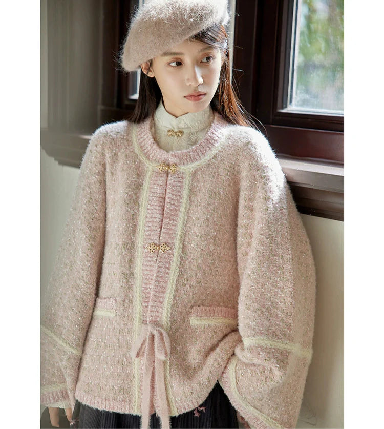 Inspired by 1960s Chanel textiles combined with Ming Dynasty construction, creating a truly unique coat. Pastel pink colors evokes a soft and romantic aura, while the texture of the knit adds a cozy and down to earth vibe.
