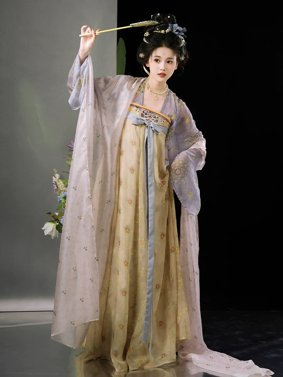 Enfilez des robes dignes des déesses avec l'ensemble Zi Xuan 紫萱 Descendant de Nüwa ! Dans des lavandes et des jaunes pastel de rêve, cet ensemble rappelle une noble de la dynastie Tang.
