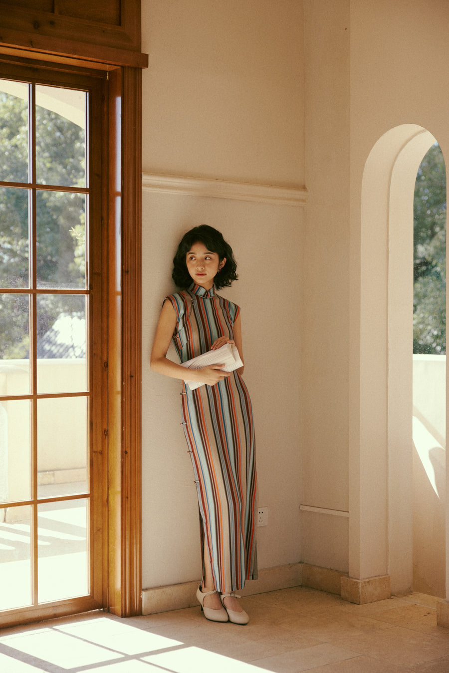 Силуэт на основе чонсамов 1930-х годов, принт в полоску в стиле ретро, вдохновленный Гонконгом 1960-х годов.