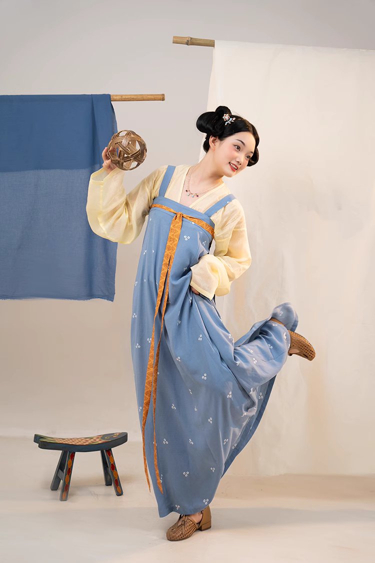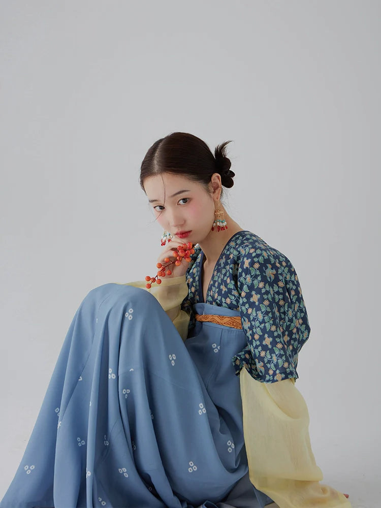 В комплект входит красивая пыльно-синяя юбка Qixiong Ruqun齐胸襦裙с классическим хлопковым цветочным принтом Тан.